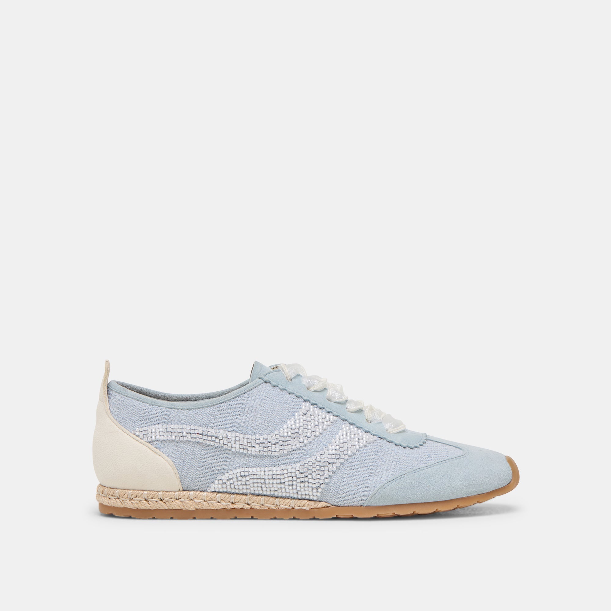 These sporty stunners are a dream to walk in. DREAM BEAD features a slim tennis silhouette that keeps you on-the go, and her burlap outer is dotted with swirling two-tone beads. sure to catch the light Grab these sporty staples natural or blue.